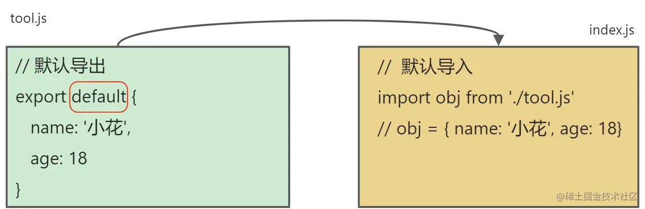 | export { name, f} | import obj from './tool.js' | 错误 |
