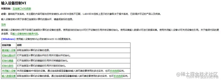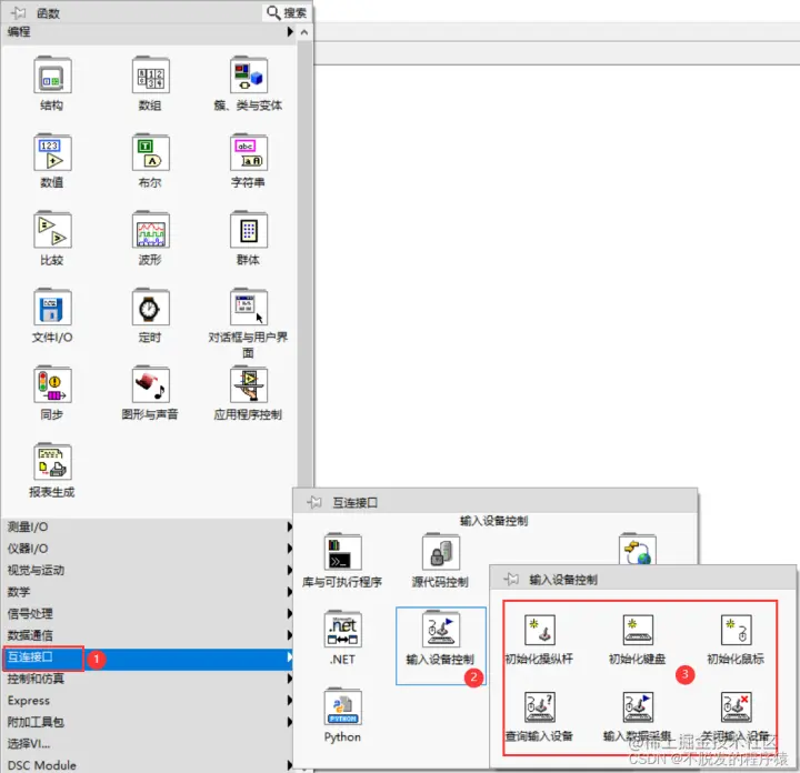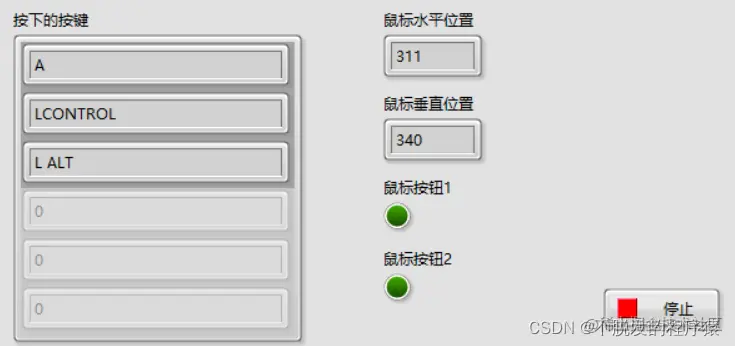 LabVIEW采集鼠标、键盘数据 CSDN不脱发的程序猿 2022-05-02 337 阅读1分钟 鼠标、键盘输入数据是应用程序最基本的交互操作方式,本篇博文将分享LabVIEW如何获取这些数据的方法。 在程序窗口,鼠标右键选择:互联接口→输入设备控制就可以看到一系列鼠标和键盘数据采集组件,如下图所示: 输入设备控制VI用于获得已连接到计算机的操纵杆、键盘或鼠标的信息,组件说明如下所示: 通过一个小案例使用输入设备控制VI监视鼠标和键盘动作,可以判断鼠标左键点击、右键点击、鼠标位置以及按下的键盘按键信息,实现代码如下所示: 效果如下所示: