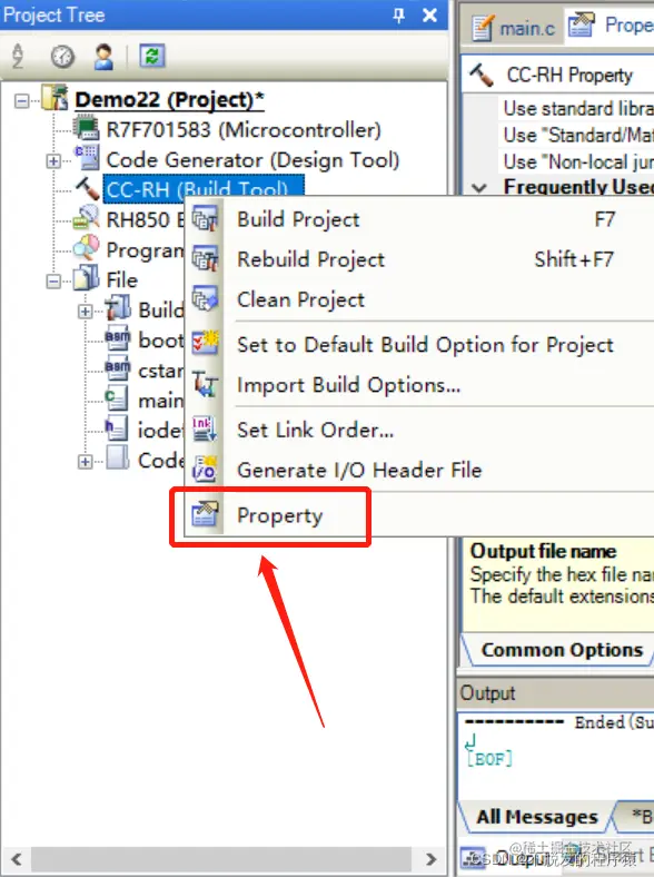 选择:CC-RH(Build Tool)→Property→Link Options,设置程序的开始地址,如下图所示: