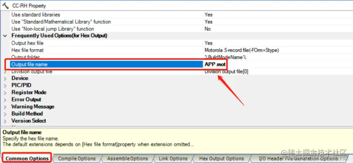选择:Common Options,设置输出HEX文件名称:XXX.mot格式,如下图所示: