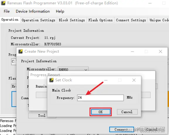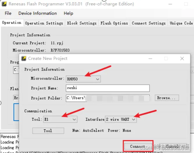 连接好烧录工具(我使用E1,RH850系列芯片)之后,打开 Renesas Flash Programmer,新建工程,点击:File→ Create New Project,具体设置如下所示: