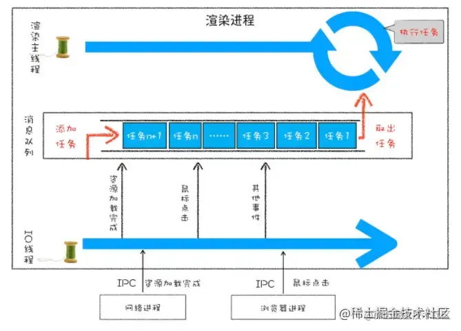 每个渲染进程都有一个主线程,并且主线程非常繁忙,既要处理 DOM,又要计算样式,还要处理布局,同时还需要处理 JavaScript 任务以及各种输入事件。要让这么多不同类型的任务在主线程中有条不紊地执行,这就需要一个系统来统筹调度这些任务,这个统筹调度系统就是消息队列和事件循环。