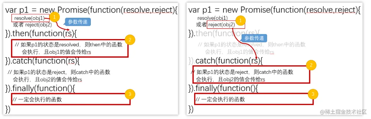 var p1 = new Promise((resolve,reject)=>{})。 - 在函数体的内部, 一般会执行异步代码,然后根据情况来调用resolve()或者是reject() 。调用resolve或者是reject后会产生什么样的后果,在后面小节介绍。 当然了,再次强调一下resolve和reject只是形参名,可以改写成其它的。