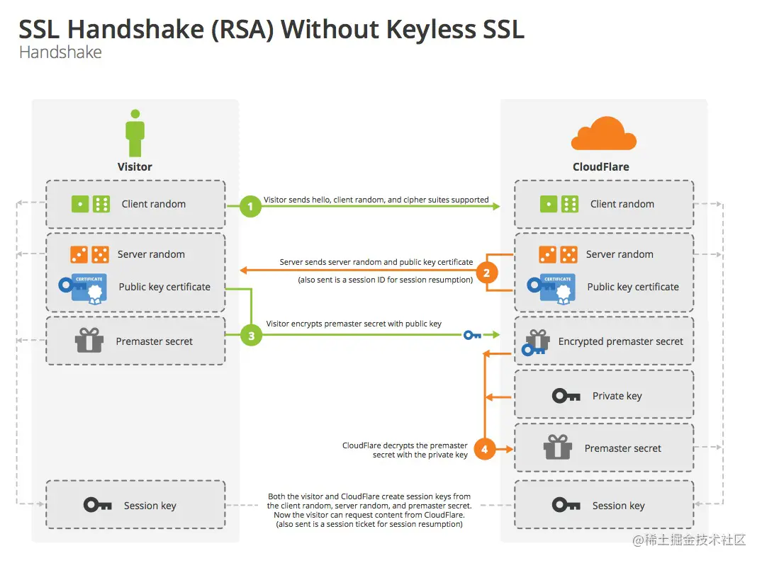 至此,客户端,服务器 都拥有了 第一个随机数、第二个随机数 和第三个随机数(预主密钥)。客户端 和 服务器 各自都会用这三个随机数计算出相同的会话密钥 session key. 此后,客户端和服务器之间的会话,就能使用对称加密的方式进行加密,即客户端 和 服务器采用的是相同的密钥解码。