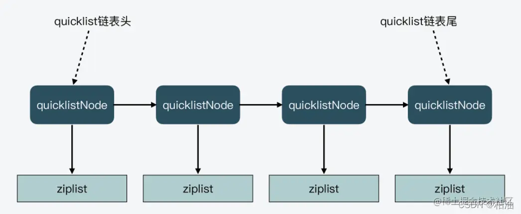 quicklist是由链表组成的结构,其中每个链表节点中都存在一个ziplist。是由ziplist改进而来,充分利用链表 + ziplist特性