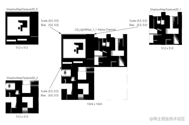 LightMapTexture和ShadowMapTexture的尺寸不一定相同,合并的时候以LightMapTexture的尺寸为上限。如果ShadowMapTexture尺寸小,那么是对LightMapTexture的 Alpha 通道的部分区域赋值;如果ShadowMapTexture尺寸更大,则偏移其 Mip 直到LightMapTexture能够放下。