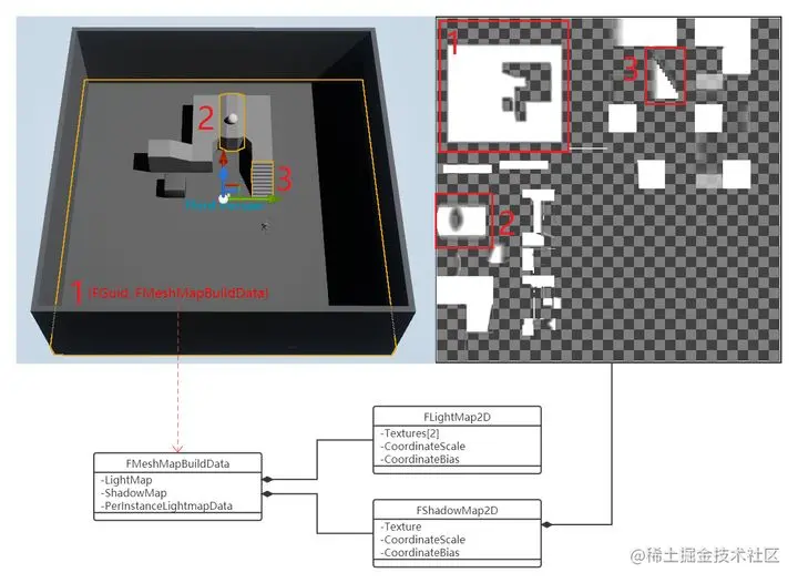 参与烘焙的静态 Mesh 顶点的 UV1 保存 LightMapUV,结合坐标 CoordinateScale 和 CoordinateBias,“标识” Mesh 在贴图中的采样区域。静态烘焙 Mesh 保存两套坐标 CoordinateScale 和 CoordinateBias,分别用于 LightMap 和 ShadowMap 贴图的采样。