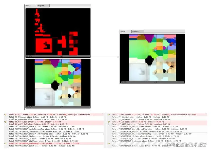 上图为真机上 ThirdPerson 测试场景的 RenderDoc 截图和 memreport -full 的内存对比截图,可以看出贴图合并后静态烘焙 Mesh 的烘焙光照渲染管线可以少了 ShadowMapTexture 采样,内存方面也没有了 ShadowMap 的内存占用。