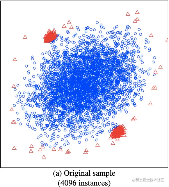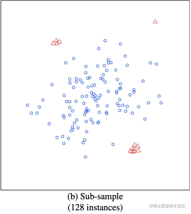 iForest的高性能还得意于它的训练并不需要全部的数据集,作者给出了一个具体的案例,数据集由4096个实例组成,其中包含两个明显的异常组。通过在全量数据和一个随机抽取128个实例的子数据集上分别执行iForest发现,全局的AUC是0.67,而子集的AUC是0.91。