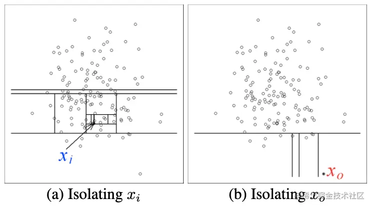作者首先给出孤立(isolation)的定义,它指的是将一个实例从其它实例中分离出去,由于异常点在数据中是少量且异常的,因此它们对于isolation操作更加的“敏感”。