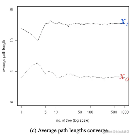 为了证实上面的想法,作者给出了一个具体的实例。通过高斯分布生成了包含135个点的数据集中,其中x0是一个异常点,xi是一个正常的点。通过随机切分的方式,x0用了4次才被完全地孤立出来(图b),xi用了11次(图a),可见异常点的路径确实会比较短。那这到底是一次偶然还是必然呢?作者又重复大量做了这个实验,随着执行次数的增加,平均的路径长度逐渐收敛了(图c),x0为4.02,xi为12.82。