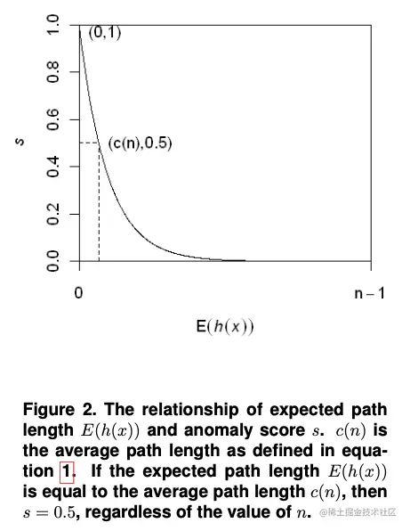 那么能不能直接用h(x)来表示异常度呢?也不是不行,但是会有几个问题:1)h(x)是受数据集样本量的影响的,即数据量大且属性多的数据集应该要比数据量小属性少的数据集的树更深,也就是h(x)会更大;2) 针对每个数据集都需要确定最终异常点的阈值。所以需要找到一个办法来将异常分值映射到0-1区间,这样才能更好地使用。