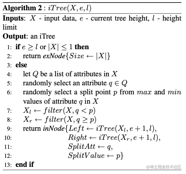 构建一颗iTree的过程就是递归递执行随机切分,即每次选择一个属性,然后从最大和最小值之间随机选择一个切分点,将数据切分为左右子集。