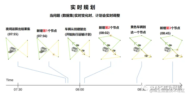实时规划则与具体的规划业务关系更强。根据业务具体要求来决定是否需要实时规划。在绝大多数的规划应用场景中,计划是一种持续性、连贯性的工作,即前后两个计划周期存在一定承接要求。通常上一个周期的执行结果,作为下一周期计划输入内容的其中一部分。因此,相邻两个计划之间的衔接存在一定的复杂度,并需要一定的设计才能切实反映实际的计划情况。之前本专栏有一篇关于两个相邻计划之间衔接的文章,提出了一些方案可参考(稍晚点会移到掘金社区):相邻两个生产计划之间的衔接问题