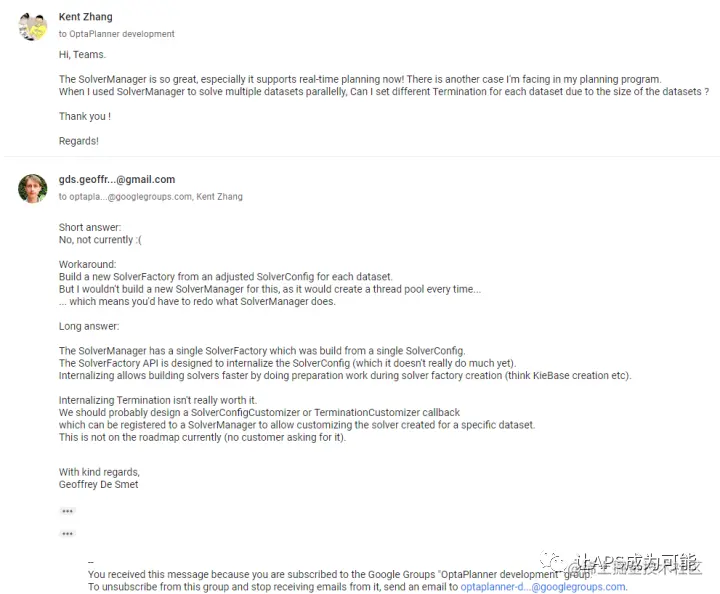通过批量、并行规划,可以实现同一个模型的多个数据集同时进行规划运算。但有同学应该会想到,不同工厂有可能规划数据集的数据量相差很大;或者不同时间(淡季旺季)因为生产任务量不同,规划数据集的数据量也会有所差异。不同的数据量展开后的问题规模差异可能是相当惊人的,从而导致所需的规划时间差异极大。那么,在批量规划的过程中,能否为不同的数据集设定不同的规划时间呢?很遗憾,OptaPlanner目前是不支持该功能的。这是一个相当实在的问题,希望OptaPlanner以后的版本可以支持。以下是OptaPlanner团队关于该问题的答复。