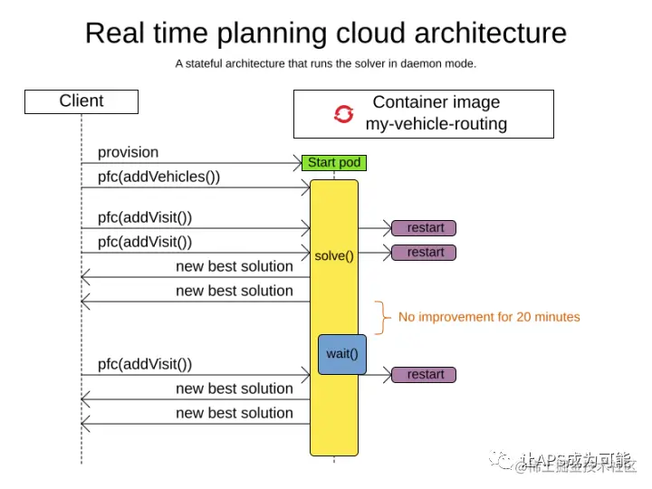 在具体的工程实践中,实时规划是一种非常实用的技术,对于一个求解器,就算没有开箱即用的功能来支持该种工作方式,到了具体应用场景中,也需要通过系统设计的办法来实现该种场景。Cplex, Gorubi, OR-Tools等求解器是否支持实时规划,本人并未深入研究过,暂不好下定论。而OptaPlanner已提供了完整的内置功能,专门用于实时规划情况。在之前发布的一篇关于机械师调度的文章中,详细描述了实时规划的过程和应用场景(稍晚点会移到掘金社区):机械师实时调度示例(I) - 实时规划关于实时规划在OptaPlanner 8.x之后,有了更为合理、好用的API,由于篇幅所限,将在下篇介绍。本文先介绍一下实时规划如何应用在规划服务中。下图显示了实时规划服务的请求 - 处理 - 响应过程