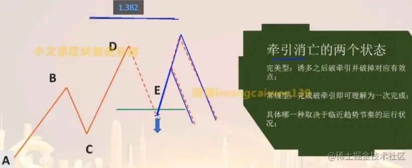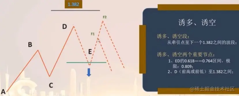 - 当价格下跌打到节奏线形成牵引点之后的反弹只要不过高点的 1.382,统称为诱多波段,相当于一个惯性