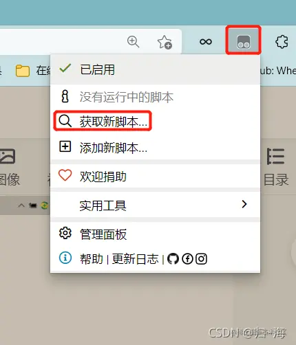 1、我们要先点击油猴这个图标,然后点击获取新脚本。