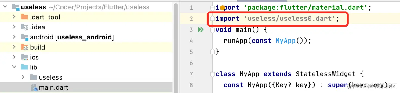 同样,这里通过个小脚本创建一个大的文件,如下的 Useless0 类通过脚本创建,大小为 1.8 MB。现在它在项目之中,但没有引入到 main.dart 里,现在看看它是否会增加打包文件大小。