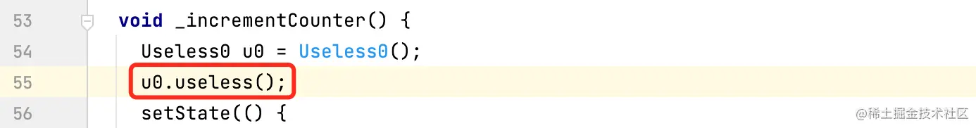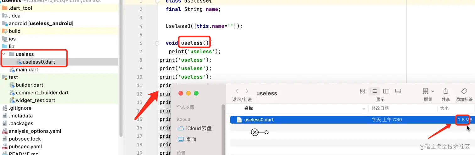 下面来一个更极限的测试,通过 Useless0 创建了 u0 对象,说明在 mian.dart 中使用了 1.8 MB 文件中定义的类,但此时 u0 是一个无用的对象。那么编译器会聪明到对这种情况进行判断吗?