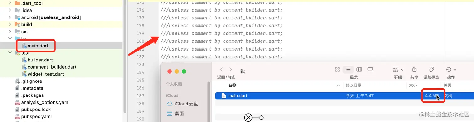 此时 main.dart 足足有 4.4 MB ,这时再打包看一下大小,如果没有体积 没有增加,则说明 注释不会被打包 。
