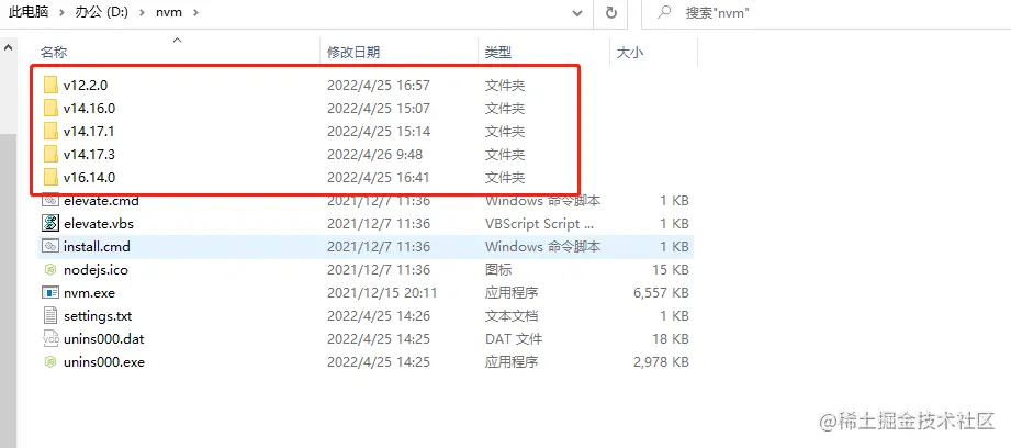 当你安装了多个版本的NodeJS之后在对应的nvm文件夹中就可以看到多个版本的NodeJS,每个版本都是相互隔离的。