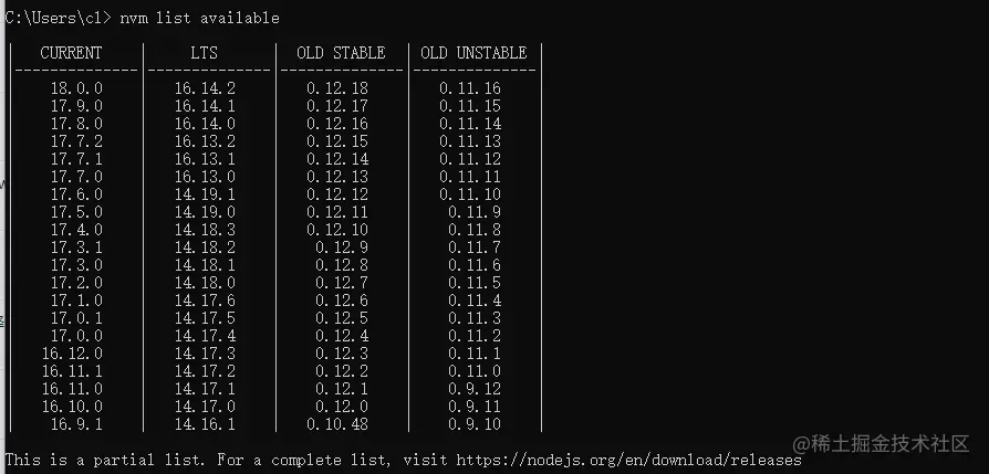 可以列出远端可用的NodeJS版本LTS代表稳定版本