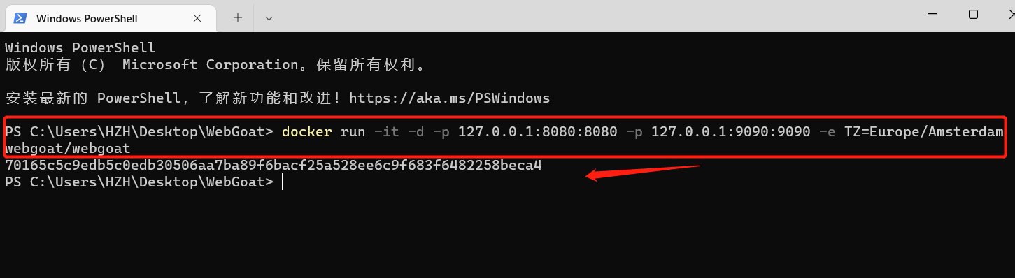 docker run -it -d -p 127.0.0.1:8080:8080 -p 127.0.0.1:9090:9090 -e TZ=Europe/Amsterdam webgoat/webgoat