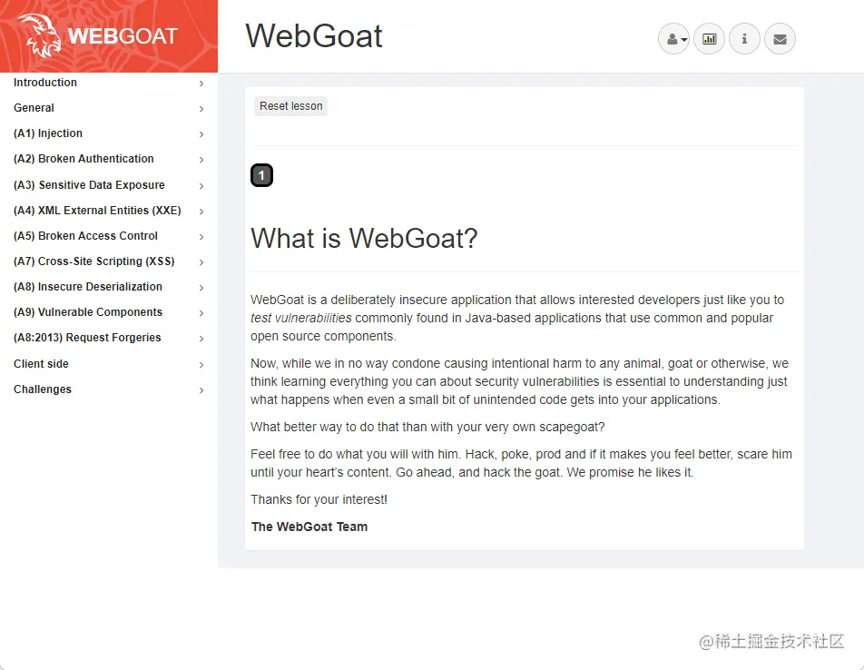 WebGoat 是 OWASP 组织研制出的用于进行web漏洞实验的靶场程序,用来说明web应用中存在的安全漏洞。目前WebGoat提供的训练课程有30多个,其中包括:跨站点脚本攻击(XSS)、访问控制、线程安全、操作隐藏字段、操纵参数、弱会话cookie、SQL盲注、数字型SQL注入、字符串型SQL注入、web服务、Open Authentication失效、危险的HTML注释等等。