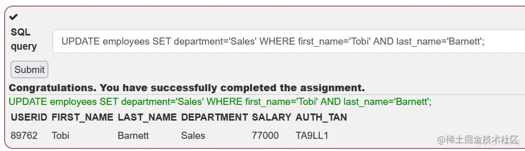这题比较简单,考察 SQL UPDATE 操作,将 Tobi Barnett 的 department 改为"Sales",输入以下SQL语句即可通关: