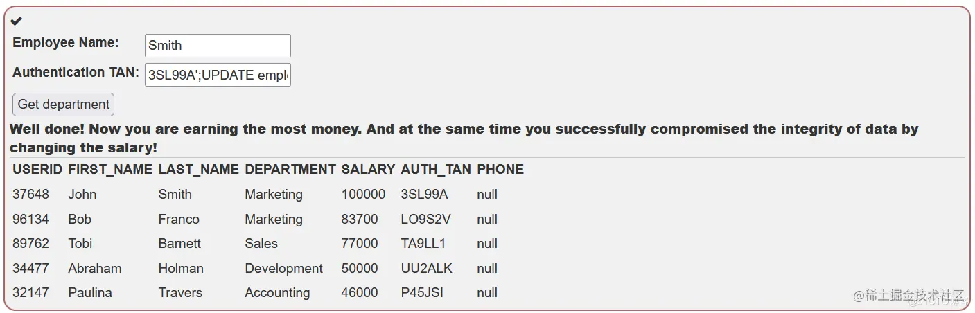 一家公司在其数据库中保存了以下员工信息:唯一的员工编号('userid'),姓氏,名字,部门,工资和交易认证号码('auth_tan')。这些信息中的每一条都存储在一个单独的列中,每一行都代表该公司的一个员工。