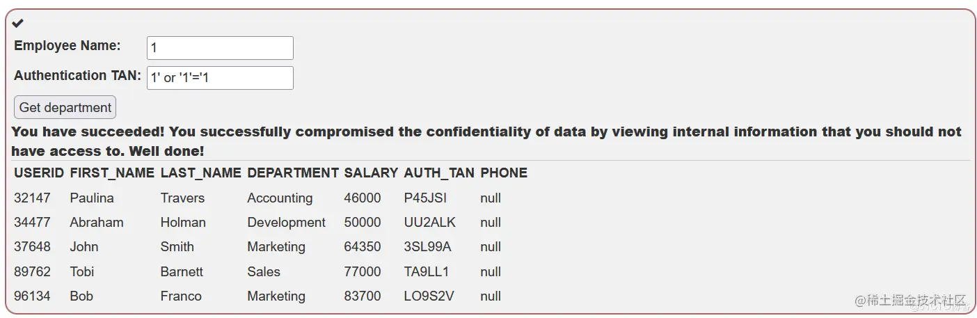 看看这个例子的表。尝试检索雇员 Bob Franco 的部门。请注意,在这项任务中,你已经被授予了完全的管理员权限,可以不经认证而访问所有的数据。