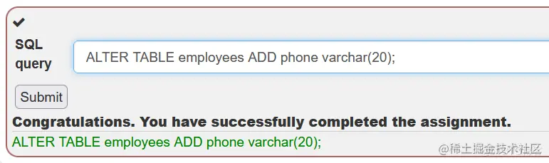 这题比较简单,考察 SQL ALTER 操作,在表"employees"中添加列"phone"(varchar(20)),输入以下SQL语句即可通关: