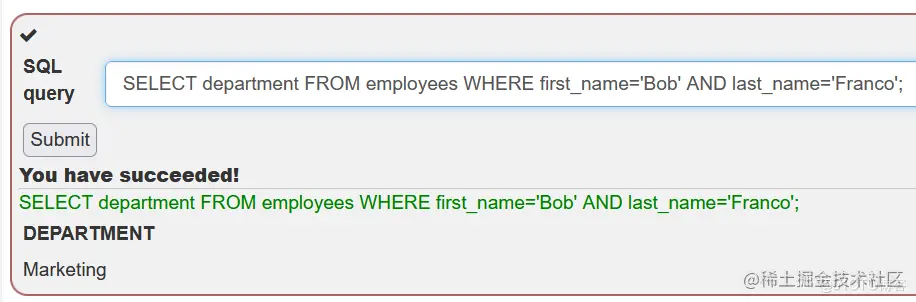 这题比较简单,考察SQL查询,检索雇员Bob Franco的部门,输入以下SQL语句即可通关: