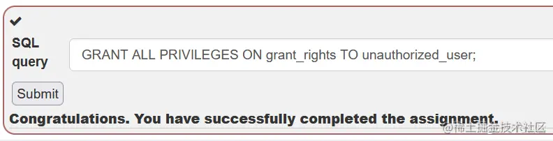 这题比较简单,考察 SQL GRANT 操作,将表grant_rights的权限授予用户unauthorized_user,输入以下SQL语句即可通关: