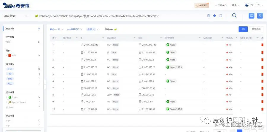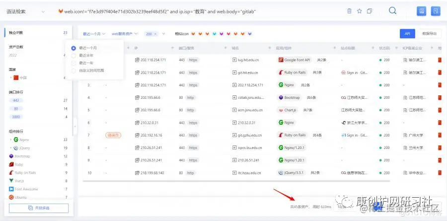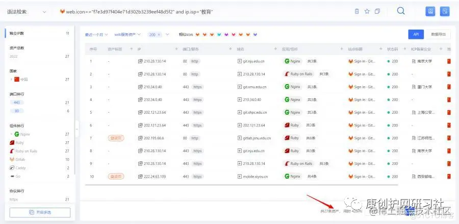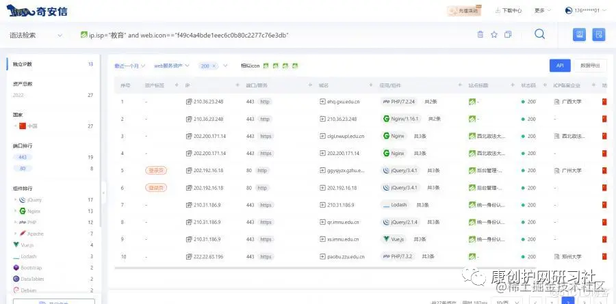 查询教育资产的语法:domain="edu.cn" 表示搜索以edu.cn为结尾的资产,ip.isp="教育",表示搜索教育网段的资产,后者的搜索规模是比前者大很多。