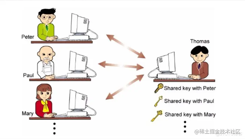 在对称秘钥加密的体系中,加密和解密使用同一个秘钥,这种方式存在一个显而易见的严重弊端,那就是秘钥的分发和管理,一旦秘钥在分发过程中被人窃取,加密形同虚设。秘钥的管理也相当繁琐,如下图,如果我们要同时与n个人通信,那么每个人都将保存n-1个秘钥。