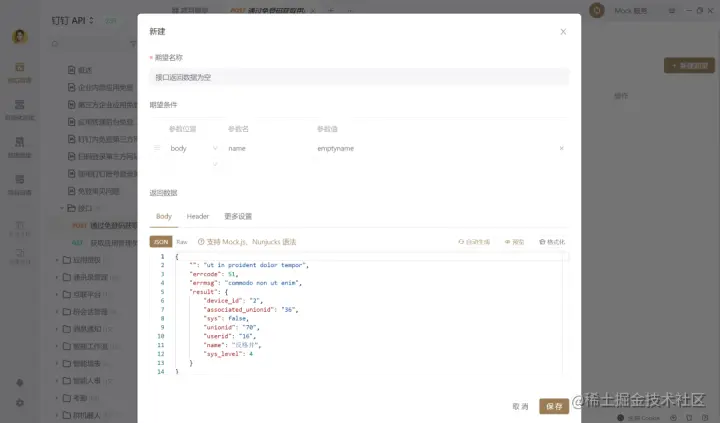 前端界面往往需要对一些后端异常返回场景做异常兼容,但开放API对这种异常场景的调试支持时不足的。这时候可以使用 Apifox提供的API Mock功能。调试的时候直接使用mock服务,在高级mock-新建期望中设置body/query等参数为某个值时,接口返回你需要的特定数据
