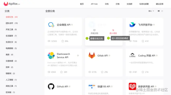 获取到调用权限后,就可以开始调试了。在API Hub里,可以直接查看接口文档,或者直接进入项目发起调试。