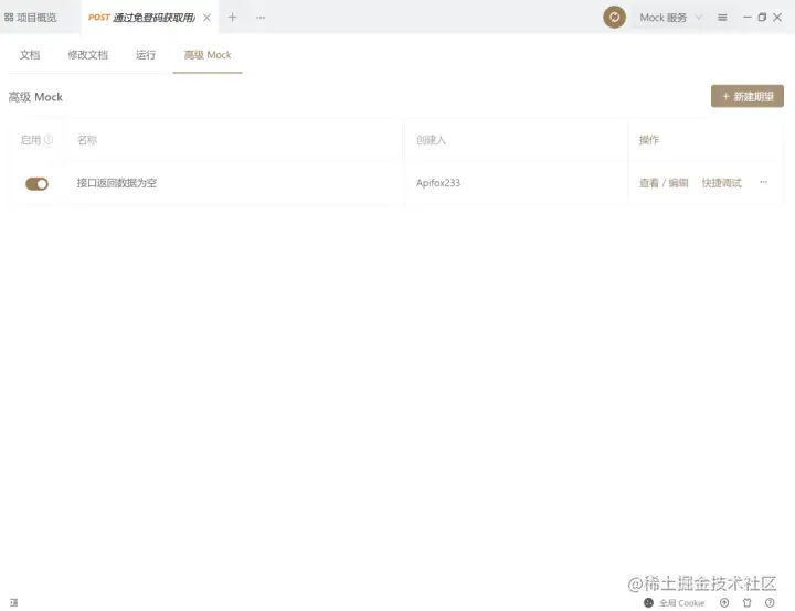保存成功的期望会显示到高级mocktab下,调试前端界面时直接使用快捷调试功能即可操作