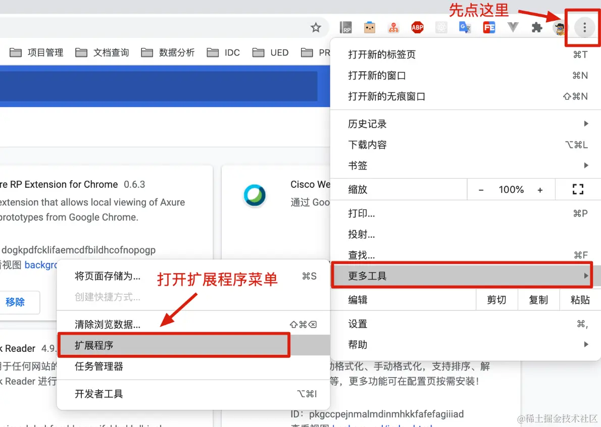 - 打开Chrome浏览器 => 点击浏览器右上角小图标,按图示操作