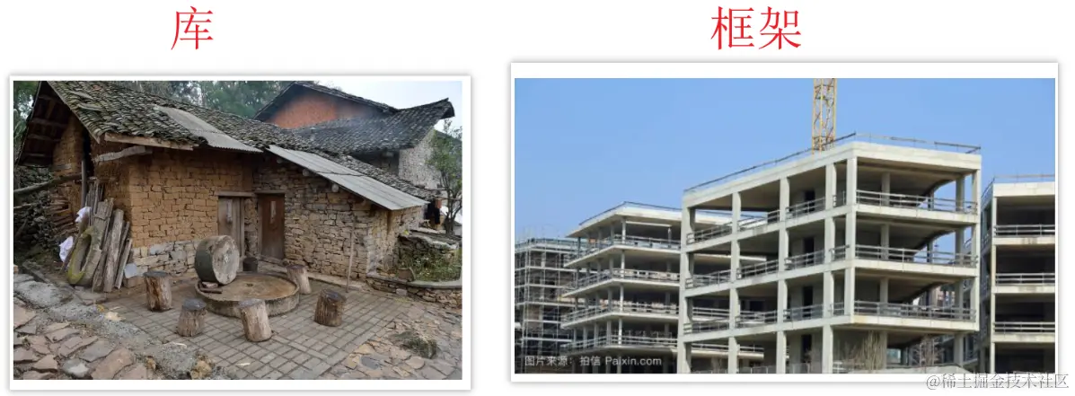 库: 封装的属性或方法 (例axios.js, jquery.js), 框架: 拥有自己的规则和元素, 比库强大的多 (例vue.js)