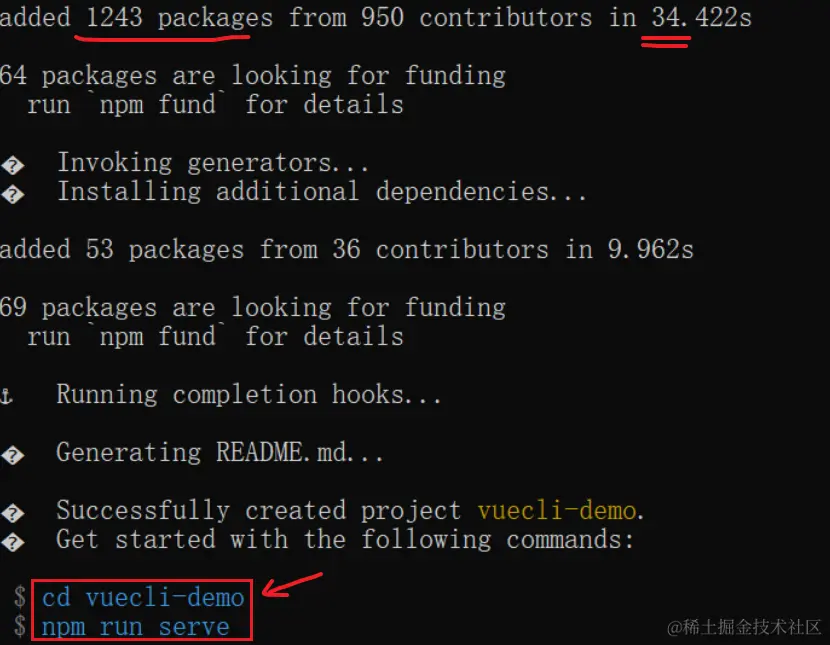 等待脚手架工作自动生成项目文件夹+文件, 并下载必须的第三方包。可能要花很久~~~