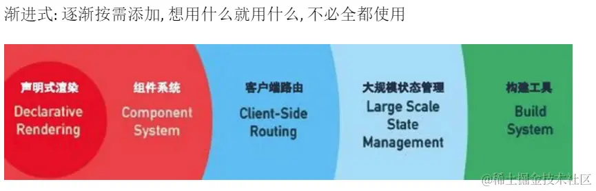 渐进式: 逐渐按需添加, 想用什么就用什么, 不必全都使用