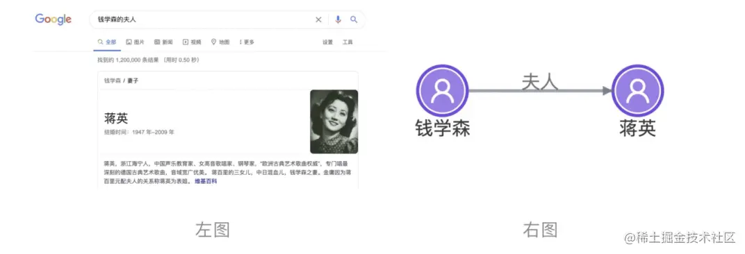 如下图所示,这是在 google 上搜索钱学森夫⼈的搜索结果(图左),通过知识图谱技术,知识抽取, 我们可以知道抽取为2个实体“钱学森”与“蒋英” ,关系为“夫⼈” ,可视化结果(图右)