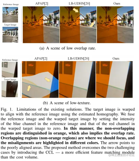 - 传统算法有基于像素的方法和基于特征的方法,前者通过迭代地估计最优同系以最小化对齐误差,例如 L1 范数、L2 范数和负归一化相关,但在低重叠率场景效果并不好;后者通过基于稀疏特征对应关系最小化重投影误差来估计单应性,在重叠率较低的场景中效果很好。尽管如此,它们的性能在很大程度上取决于特征对应的质量,通常在低纹理、低光或低分辨率场景中失败。