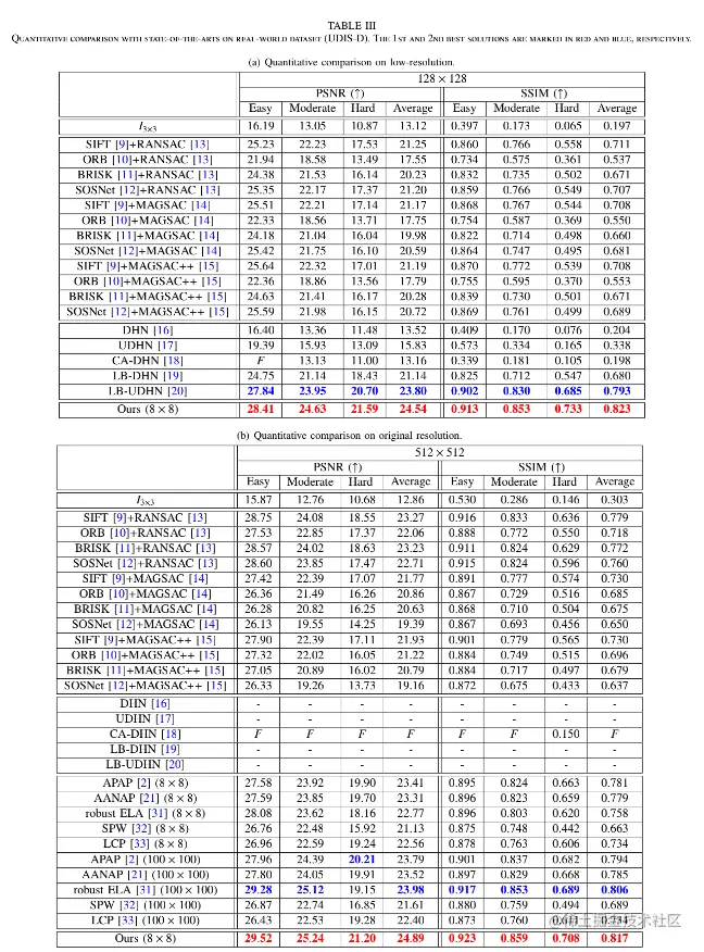 此外,我们在 UDIS-D 中以两种不同的分辨率进行实验,如表3 所示。形式上,UDIS-D中图像的分辨率为512×512,我们将它们调整为128×128以获得低分辨率版本,原因有两个: