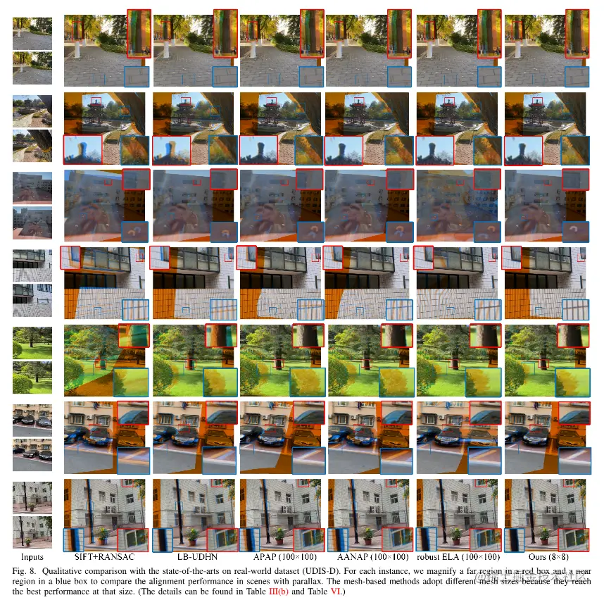包含丰富深度级别的真实世界图像对是在不同的相机基线下捕获的,这表明由于视差,它们无法使用单个单应性对齐。因此,在这个真实世界数据集(UDIS-D)中,我们添加了与多单应性解决方案的比较——APAP [2]、AANAP [21]、鲁棒 ELA [31]、SPW [32] 和 LCP[33] .由于我们网络中的网格是 8 × 8(我们的网络中采用 8×8 网格的原因将在第 4.5 节中解释),将我们的网格与这些将网格设置为 8 × 8 的方法进行比较是公平的。为了进一步突出我们的性能,我们还将它们与设置为 100 × 100 的网格进行比较。
