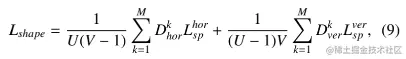 根据等式(8),我们可以计算变形网格水平和垂直方向的相似矩阵( ),它们的大小分别是 U X (V-1)和 (V-1) X U。最后,提出的深度感知形状保持损失如下所示: